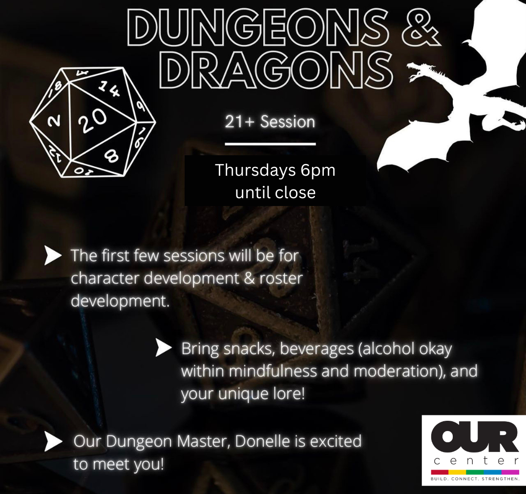 Join Dungeon Master (DM), Donnelle in a series of curated adventures. Join at any time. No experience needed. Please email or call the center with any inquiries. No sign up or registration needed! Just show up 🙂