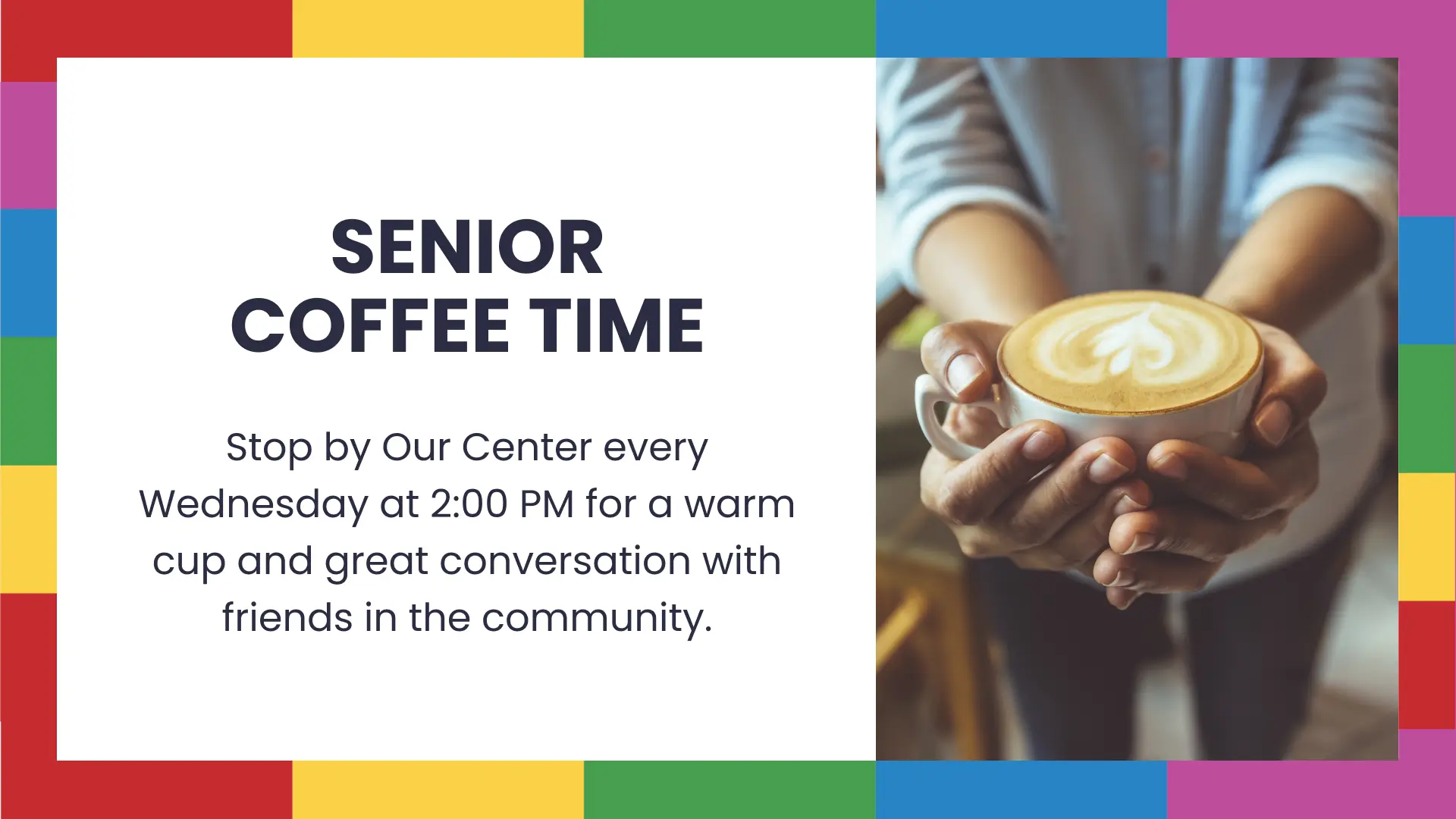 Senior Coffee Time is the perfect mid-week break. Join us for a casual hour of coffee, tea, and connection. Whether you want to catch up with old friends or meet new neighbors, our doors are open for a cozy afternoon together.