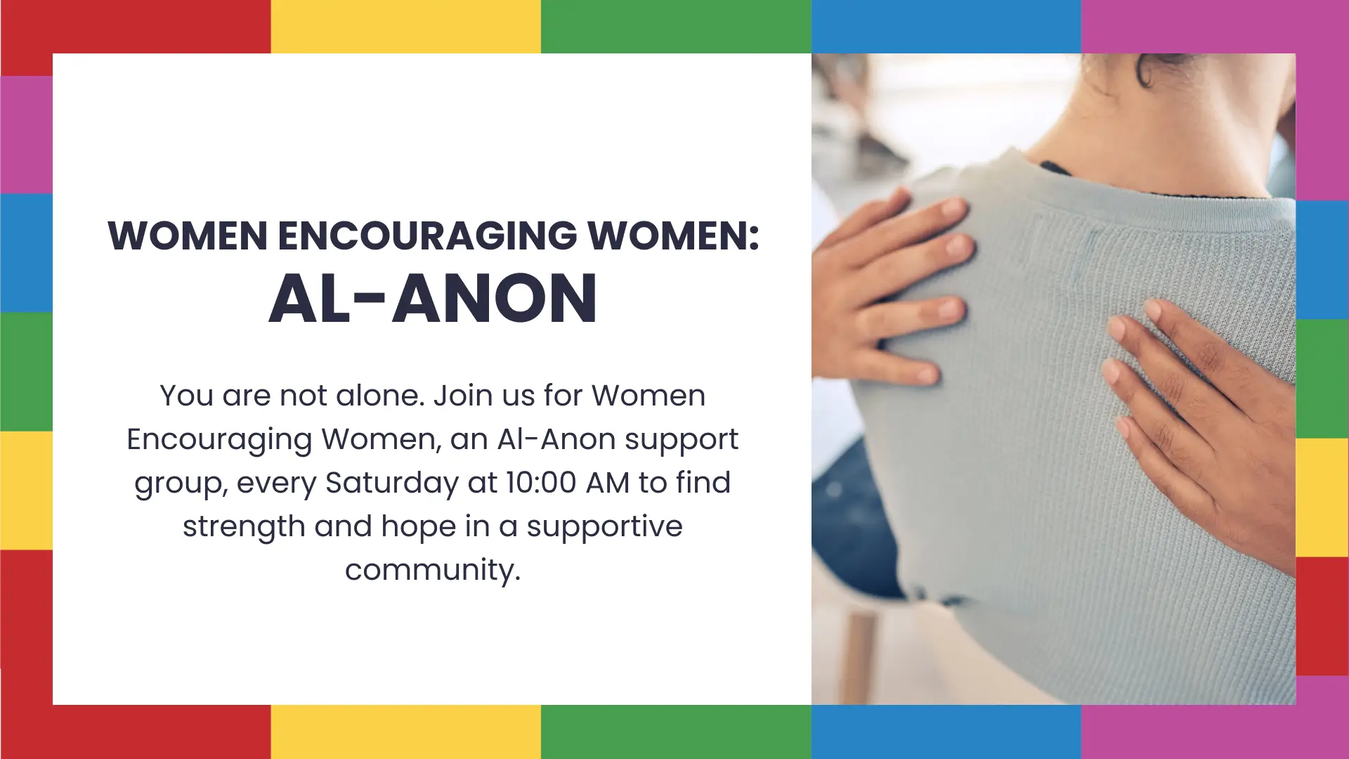 Women Encouraging Women is a weekly Al-Anon meeting providing a safe, confidential space for women who have been affected by someone else’s drinking. Come share your experience and find support through the Al-Anon program in a welcoming environment.