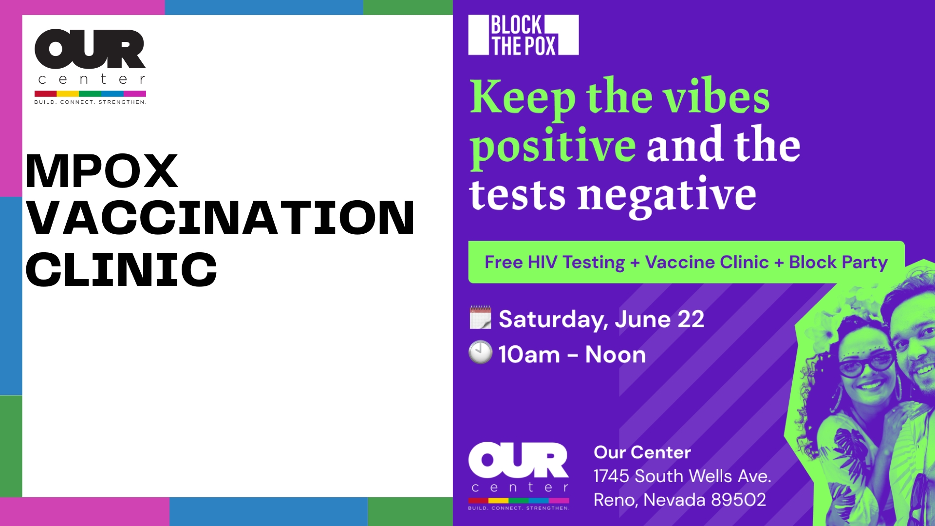 Our Center 1745 S Wells Ave, Reno, NV, United StatesOur Center is partnering with the Office of State Epidemiology and Northern Nevada Public Health to bring FREE mpox vaccines to our community. Join us on June 22nd from 10am-12pm right here at Our Center to get vaccinated and learn more about mpox resources and prevention. Pick up a free and fun hygiene kit, brought […]