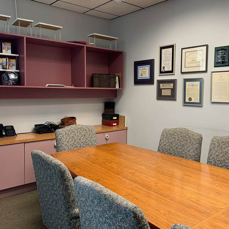 Enclosed space with a conference table and chairs for up to 12 people. The board room has a projector that is available and can be used for zoom meetings.