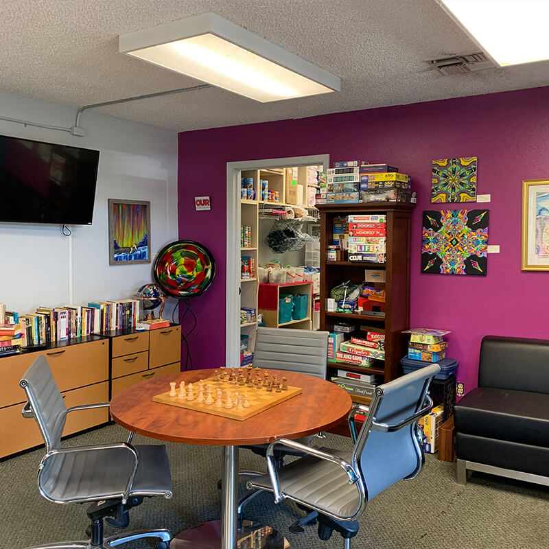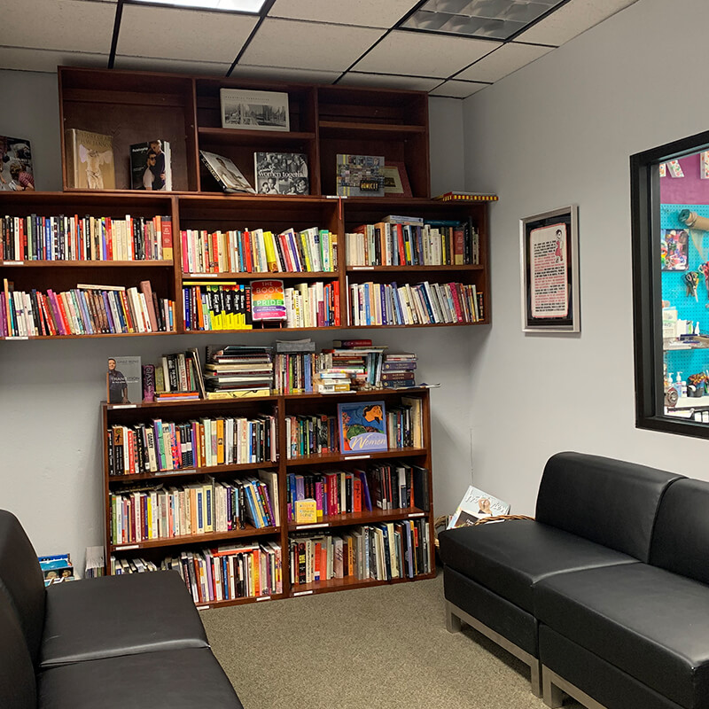 Appropriate for groups up to 20. This space includes different seating options and a variety of books and board games that are available to use.